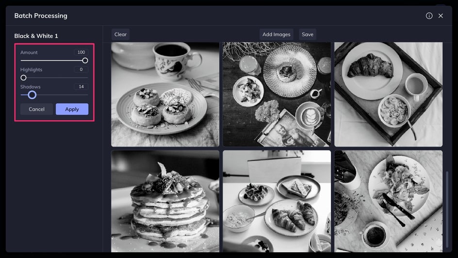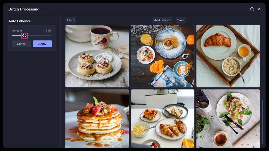 To edit photos as a batch, simply click the Batch button at the top of the Photo Editor. Or, head directly to the Batch Photo Editor. Click the Add Images button or drag and drop all the images you’d like to add from your computer. You can upload as many images as you want!