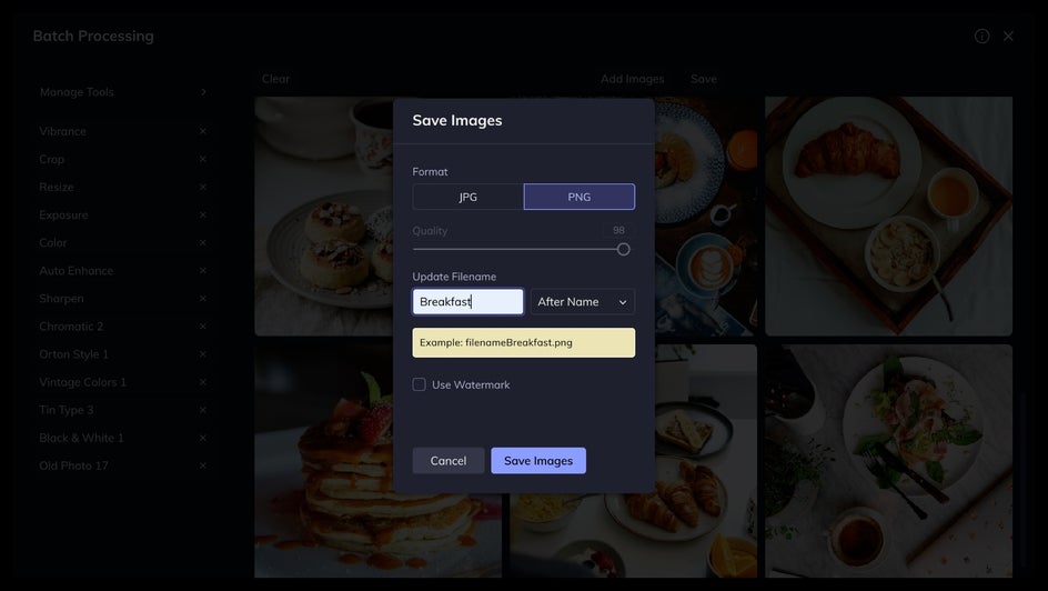 When you're ready to save your edited photos, click the Save button at the top of the Batch Processing menu. You’ll have options to save as JPEG or PNG files, as well as naming options for organizing each image file within the batch. Type a descriptor into the Update Filename box, then choose whether you'd like what you've typed before the filename or after the filename using the dropdown.