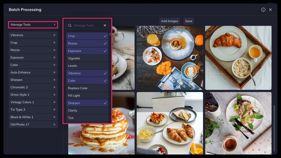 If you don't see your favorite tool or effect on the quick access list, fear not! By clicking the Manage Tools button at the top of the list, you can search BeFunky’s Photo Editor for tools and add them right to your quick menu. This way, you’ll always have your favorite photo editing tools at hand when batch-processing your images.