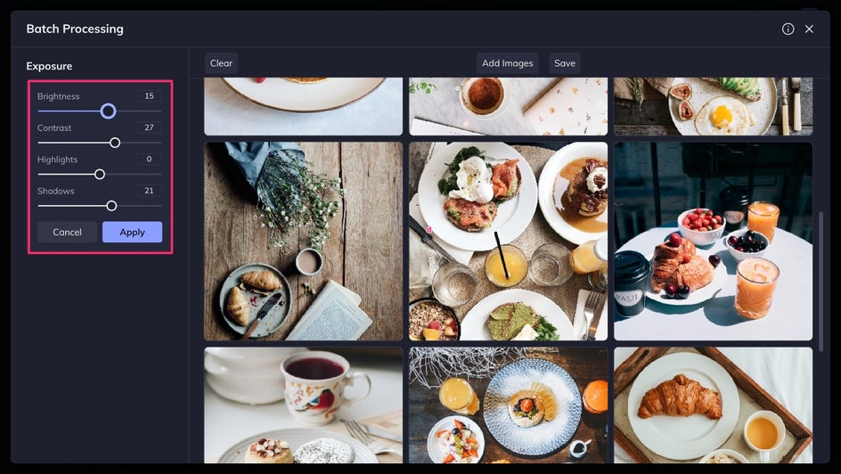 This one is particularly handy if you’ve got a batch of photos from the same photoshoot or time of day. If they all need some adjusting in the exposure department, the Exposure tool has sliders to enhance the brightness, contrast, highlights, and shadows.