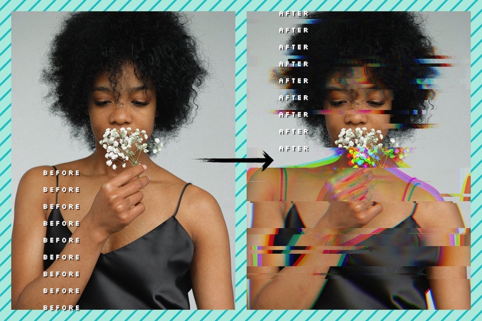 Adding a pattern to the background of your collage template can complement your Before and After when layered with effects or unique text. Here, a Glitch Art effect is combined with a striped background for an even more distorted look.