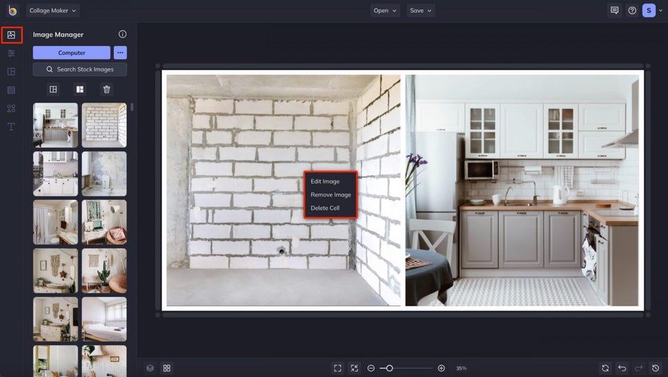 Next, head to the Image Manager and choose your preferred method of adding your photos. You can even drag and drop your images directly into a collage cell! Once they're in your collage, a single click on an image will give you three options. Edit Image allows you to access photo editing straight through the Collage Maker.