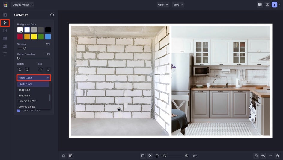 Now, you can edit the dimensions, orientation, spacing, and background color of your template by going to the Customize tab. For our Before and After images, we changed the orientation to 16:9, which flatters the composition of our images more.