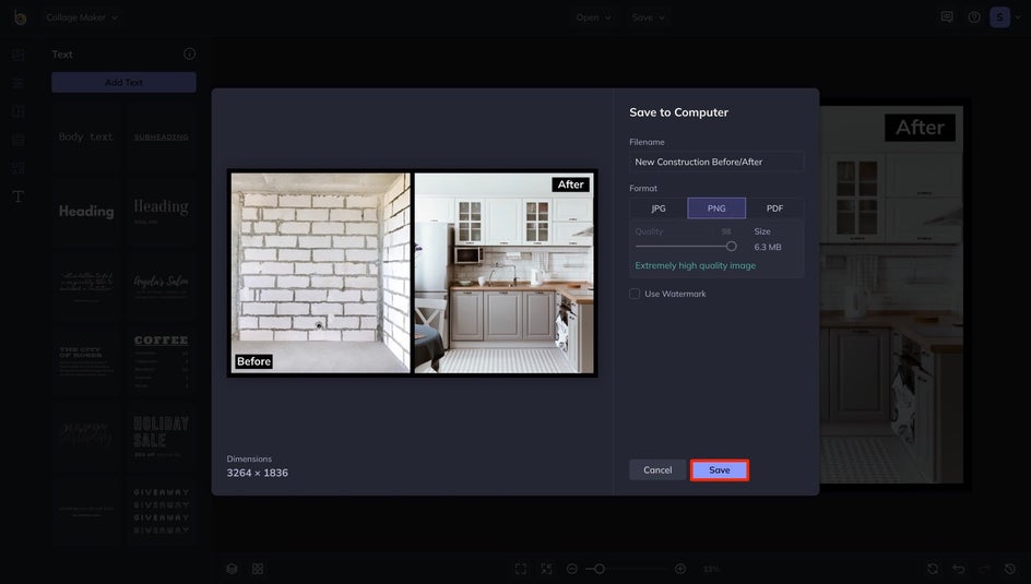 Once you're satisfied, click the Save button, which can be found at the top of your canvas. Then, choose whatever destination you prefer. If you're sharing it online, a high-quality PNG image is suitable. But if you are looking to print it, be sure to save it as a PDF with Print quality.