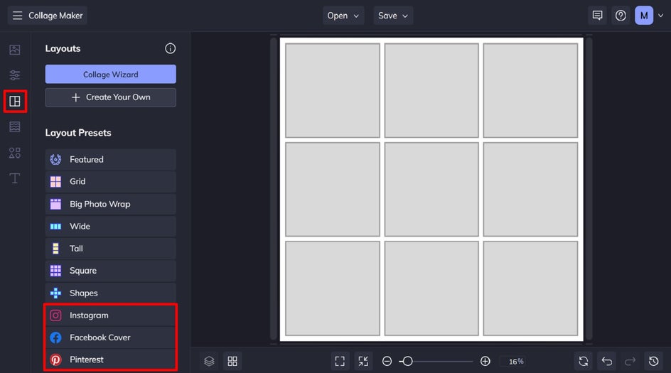 Navigate to Layouts in the main menu on the left, then scroll down to select the type of collage you’re creating: Instagram, Facebook Cover, or Pinterest. Then, select the layout that takes your fancy.