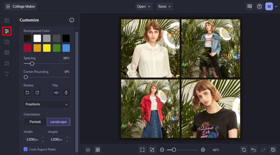 You can also adjust the colors, borders, and spacing to make your collage uniquely yours. Just navigate to Customize in the main menu to do this. Additionally, you can resize your collage template so it’s optimized for the size specifications of your chosen platform. Type in your new measurements within the Width and Height boxes. Don’t forget to check Lock Aspect Ratio to prevent your social media collage layout from becoming distorted!