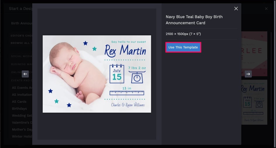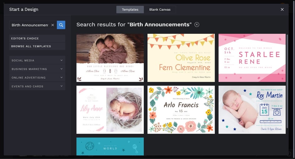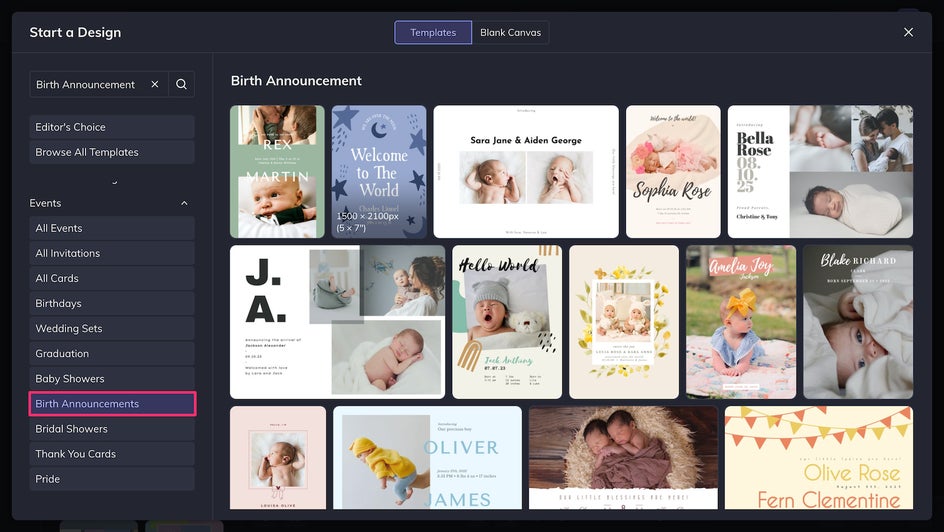 The Card Maker offers plenty of birth announcement templates for you to choose from – just navigate to the Birth Announcement category in the sidebar.