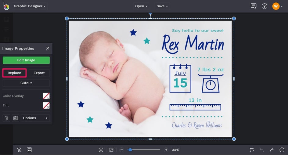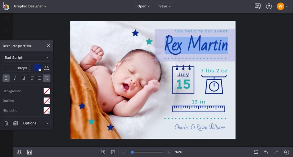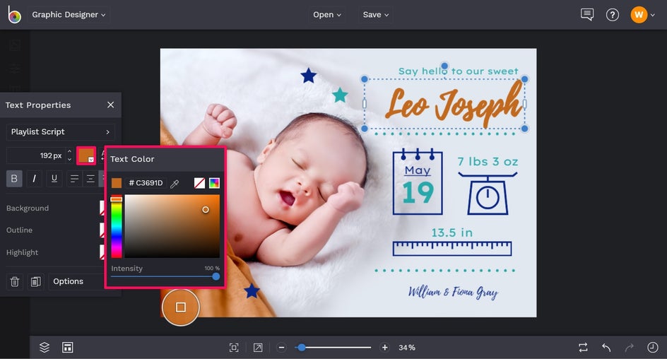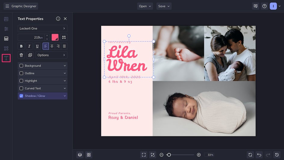 Next, it’s time to edit the text and add your own newborn’s information. Use the template’s existing font or choose your own from hundreds of available typefaces. Change the text color or add a layer effect for increased visibility.
