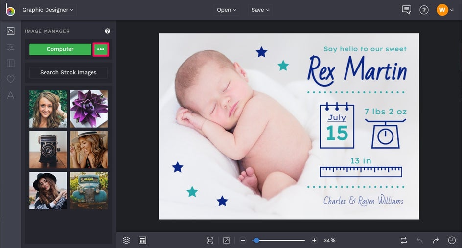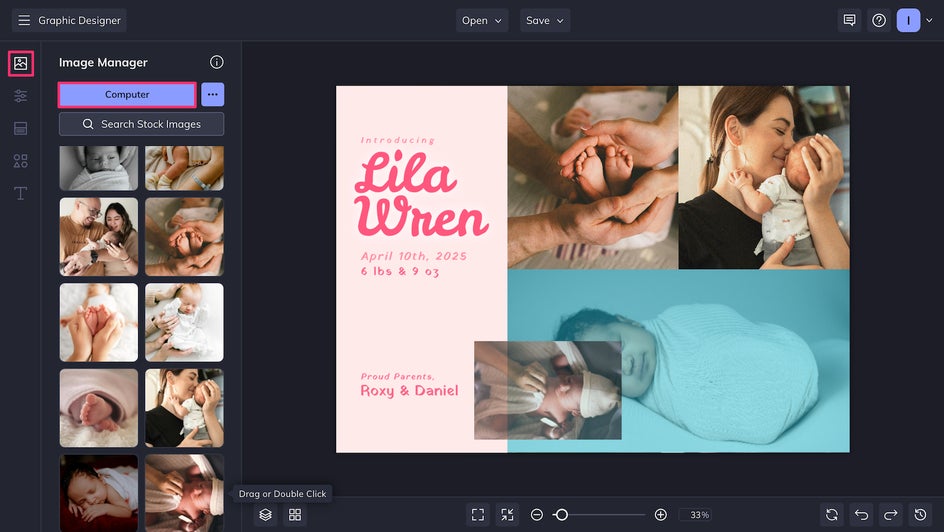 Upload your brand new baby photos to the Image Manager. Click and drag your photos of choice onto the canvas to replace the existing placeholder images.