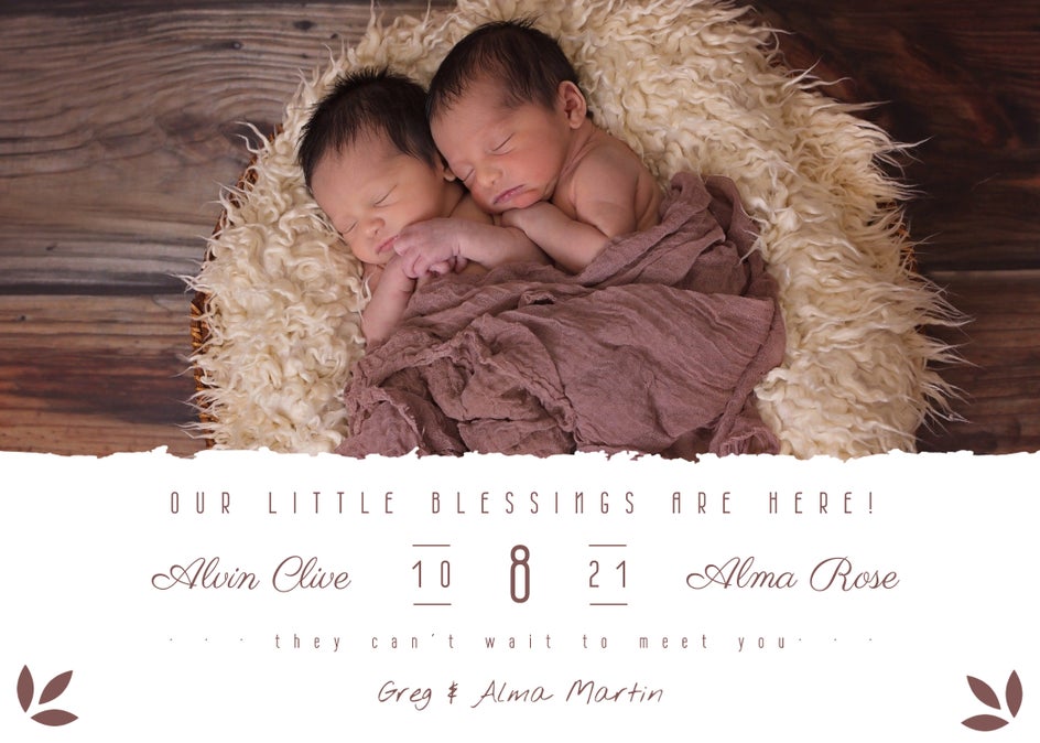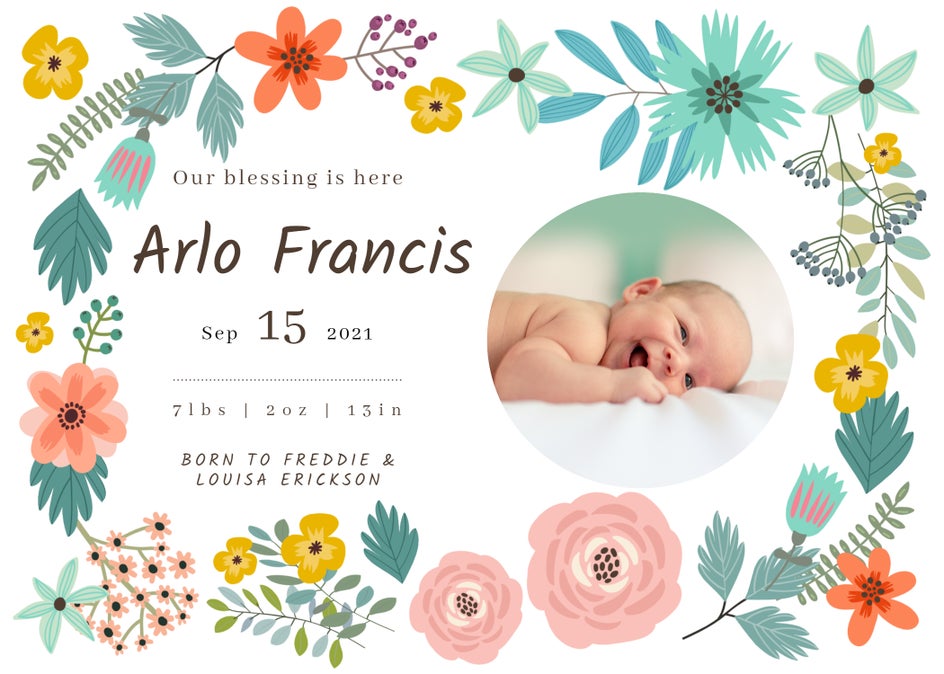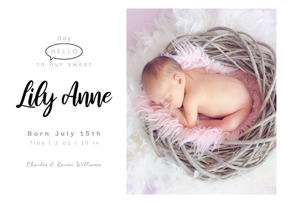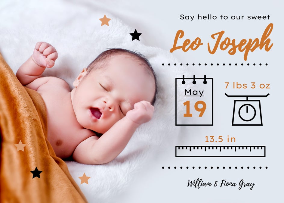 You get to choose exactly what information to include in your birth announcement, but typically, you’ll include the baby’s name, date of birth, the name of the parent(s), and potentially the baby’s weight and length. If you have the time, you can include a personalized note on the back of the card, or give a short description of the birth and how the family and baby are doing now.