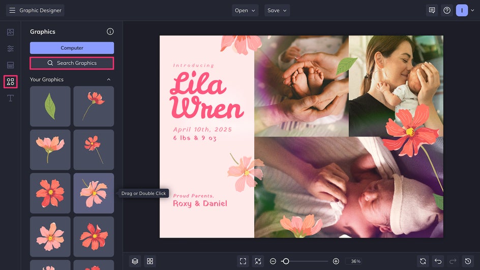 If you want to add a little more flair to your card, BeFunky has an entire library of hand-drawn vector graphics that you can add for a truly one of a kind birth announcement. Browse through the many different collections, or use the Search Graphics tool if you have a specific type of graphic in mind. Here we’ve searched for “flowers” and “leaves” to mix and match across our canvas.