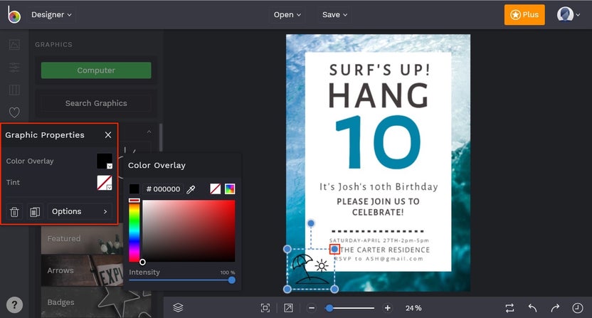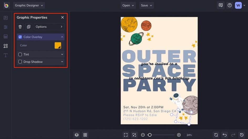 You’ll find each graphic you selected in the Your Graphics section. Drag and drop them onto your Birthday Invitation template before resizing and repositioning the graphics. You’ll notice that each time you select a graphic, a Graphic Properties menu appears on the left which allows you to customize the color scheme, add a drop shadow, and more.