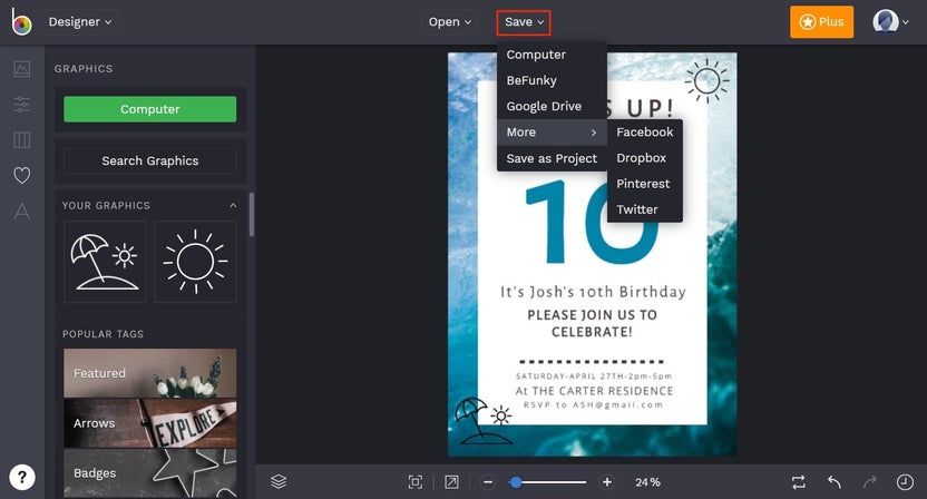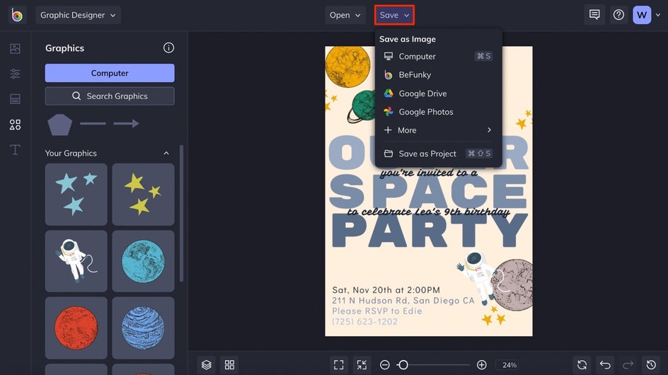 Once your kids’ Birthday Party Invitation is looking spectacular, click the Save button at the top of the page. You’ll be presented with several options for saving your design.