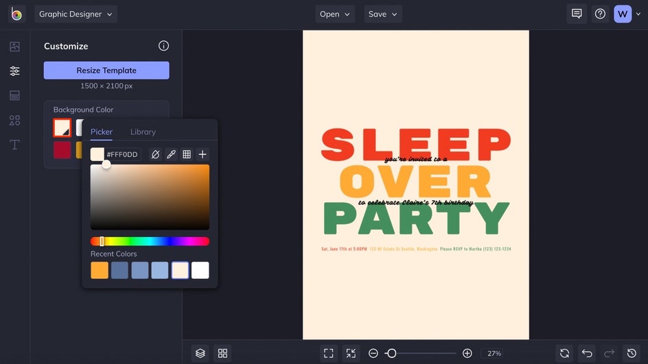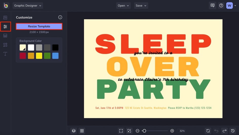 With the birthday party invitation template loaded onto the canvas, click the Customize tab in the main menu on the left. We’ve chosen to resize this template so that it’s portrait orientation instead of landscape. To do that, click the Resize Template button and type in any dimensions.