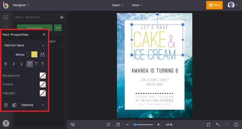 Next, you’ll want to add all the party details to your invitation. Double click any textbox to change what the text says, then use the Text Properties menu that appears on the left to change the font, text colors, and more.