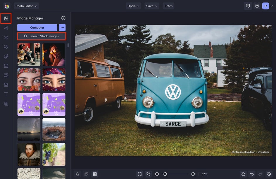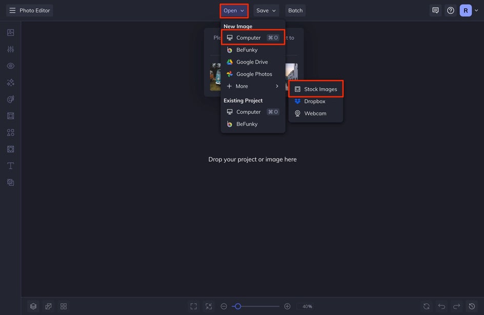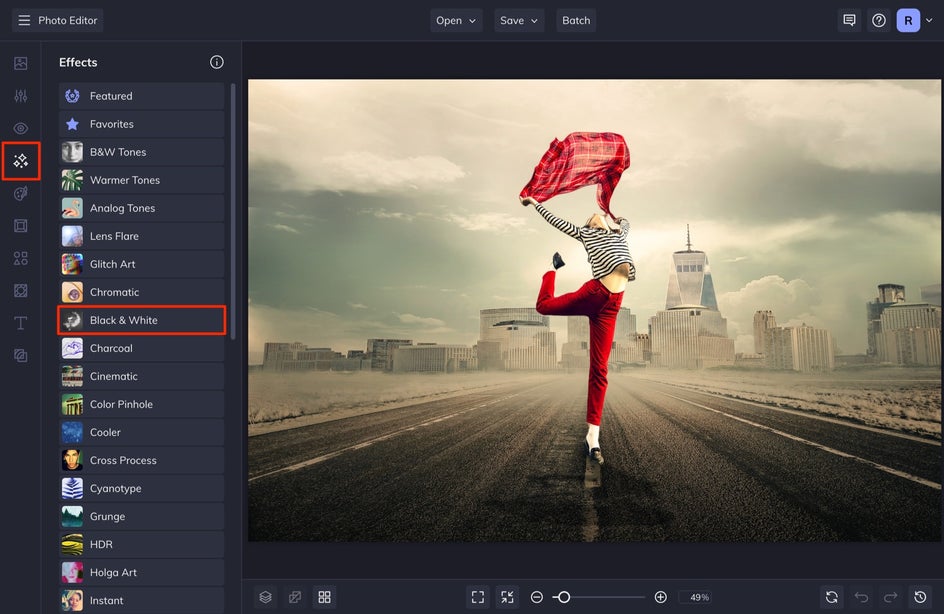 To get started, open up the Effects tab of the Photo Editor. Here you’ll find hundreds of customizable filters and effects to choose from, including Black & White filters and B&W Tones. Upload an image or simply drag and drop it onto the canvas.