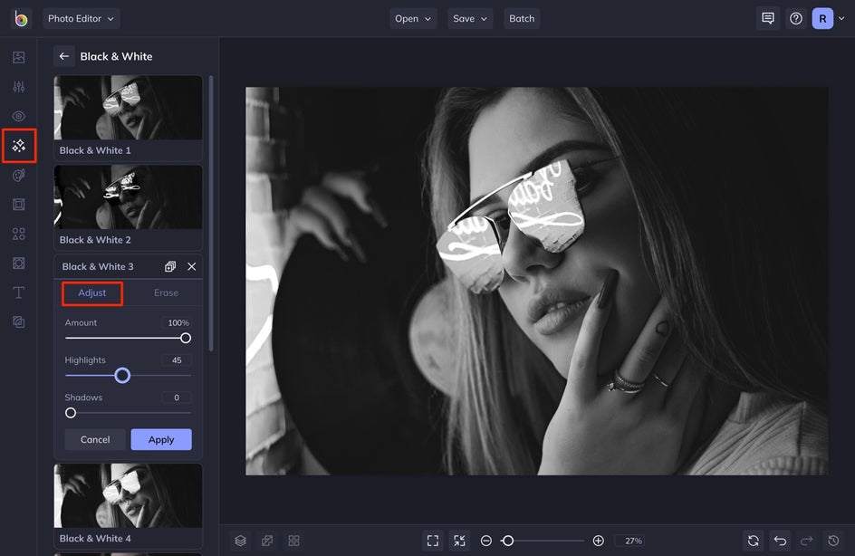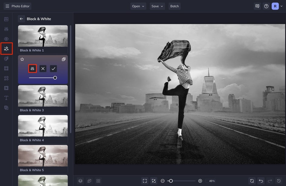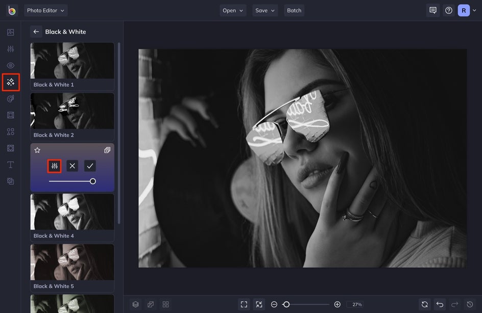Different black and white effects produce differing levels of contrast and tone, so browse through before selecting your favorite. Here we’ve decided on B&W Tones 6. Click the slider icon to open up the customization options.