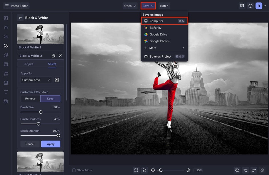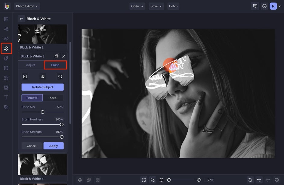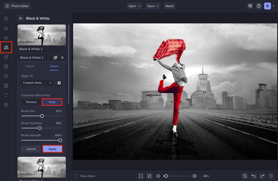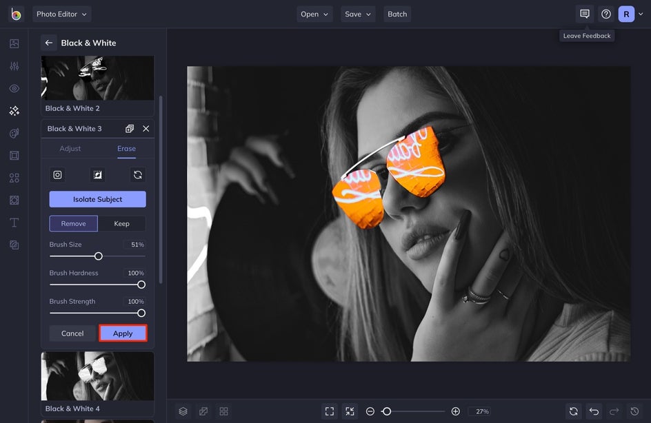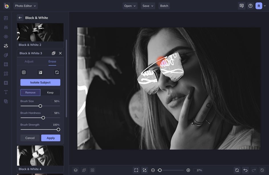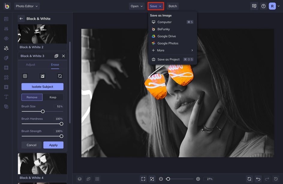 BeFunky’s AI will automatically select the subject, resulting in an instant splash of color. Alternatively, reverse the effect using Invert Selection next to the drop-down menu. If there are any other areas of the photo you want to colorize, or revert to black & white, drag your mouse across the canvas to use the brush tool – Remove will colorize, while Keep will desaturate.