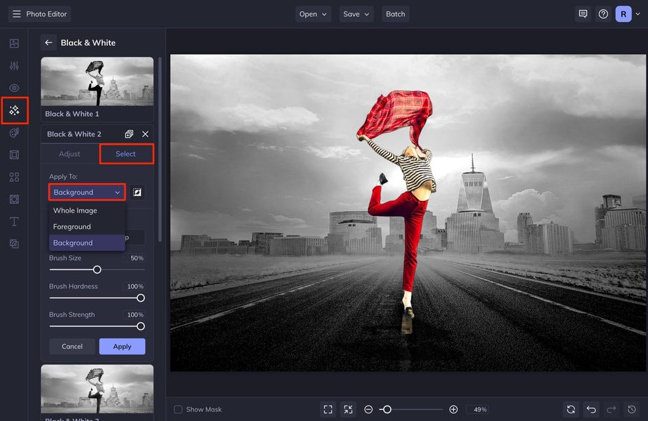 Click on the Select tab. Here, the drop-down menu can be used to apply the black & white effect to the whole image, only the foreground, or only the background. To colorize the subject of the photo while keeping the rest in black & white, select Background.