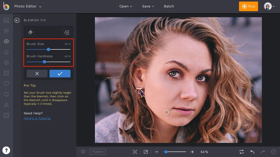 This tool is designed for quick spot removal. When you open the Blemish Fix tool from the Touch Up tab, you’ll be able to adjust the brush size and hardness to suit the type of blemish you're editing. Once it’s dialed in, simply click on a blemish to remove it.