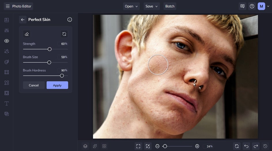 On high-resolution images, the tool works exceptionally well because it can detect the contrast between blemishes and surrounding skin. For lower-res photos, use the Upscale tool or zoom in and use a smaller brush size to get more accurate results.