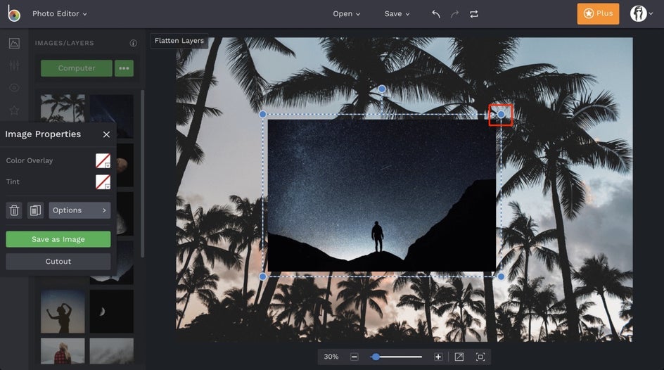 In the Image Manager tab, upload a file from your computer, your image library, or choose from BeFunky’s large selection of free stock photos. Once your image uploads, it will appear in the Image Manager tab as a thumbnail. To add it to the base image, simply double click the thumbnail or drag and drop it onto your base layer. From there, resize the active image layer by clicking and dragging the blue circles at the edge of the image.