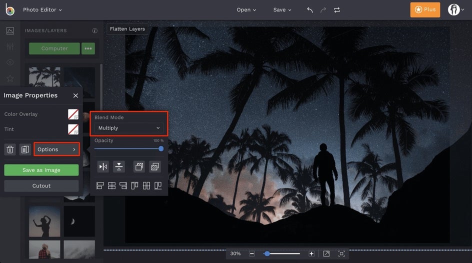 You’ll notice that any time your active layer is selected, the Image Properties menu opens in the sidebar. This is where you’ll find your Blend Modes. Click on Options in the Image Properties menu and you’ll see the Blend Modes dropdown menu. Clicking through the different blend modes will allow you to see how they’ll look as they blend your layers together.