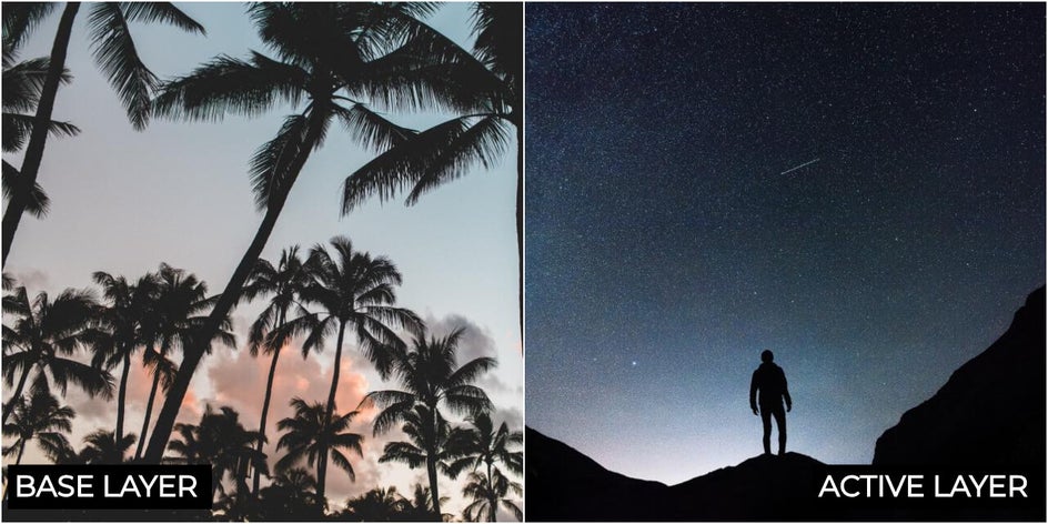 Blend Modes are actually mathematical algorithms that dictate how two layers interact with each other. Luckily, you don’t need to do any math yourself: You can change the Blend Mode in a couple of clicks. By selecting a new Blend Mode for the top layer, also known as the “active layer,” you can essentially tell it how to blend with the bottom layer. In the following image, we used the Darken Blend Mode: