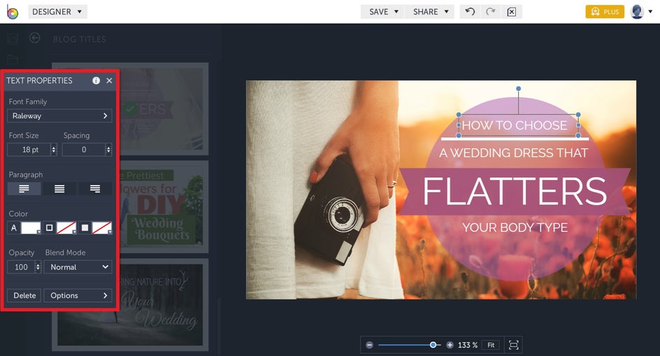 The next step is to edit the template’s existing text, so it reflects your own blog post’s title. You can do this by clicking on the text boxes you want to change before typing the new text. When you click on any text box, a Text Properties panel appears, from which you can change elements such as font, font size, spacing, alignment, color, and more.