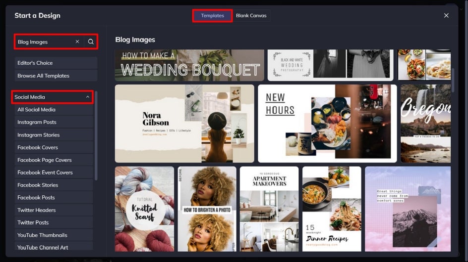 Within the Templates Library, navigate to Social Media, followed by Blog Images. Alternatively, you can simply type Blog Images into the search bar in the top-left of the screen. Here, you’ll find BeFunky’s wide range of templates dedicated to bloggers.