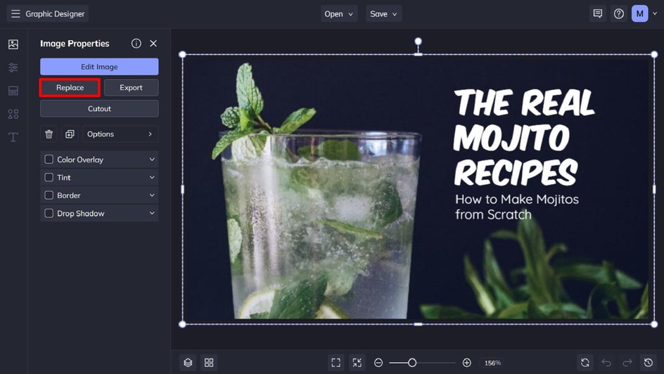 First up, you’ll want to change your template’s photo to reflect your own blog post content. To do this, click on the photo and an Image Properties menu will appear. Selecting Replace Image will allow you to open an image from your own files.