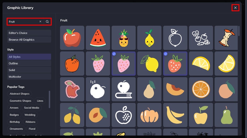 Within the Graphics Library, you can search for theme-specific graphics using the search bar in the top-left of the screen. Click on the graphics you wish to use, and they’ll be available in the Your Graphics section once you exit the Graphic Library. Simply drag and drop them onto your design, then resize or reposition them using your mouse.