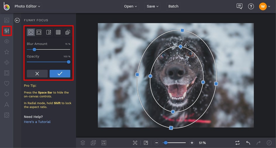 You can adjust the target’s size by clicking on the blue circles and dragging them with your mouse inwards (to make it smaller) or outwards (to make it larger). You can also reposition the target so the area you want to remain completely in focus is in the center of this shape. Your photo will then gradually fade out of focus from the point you selected.