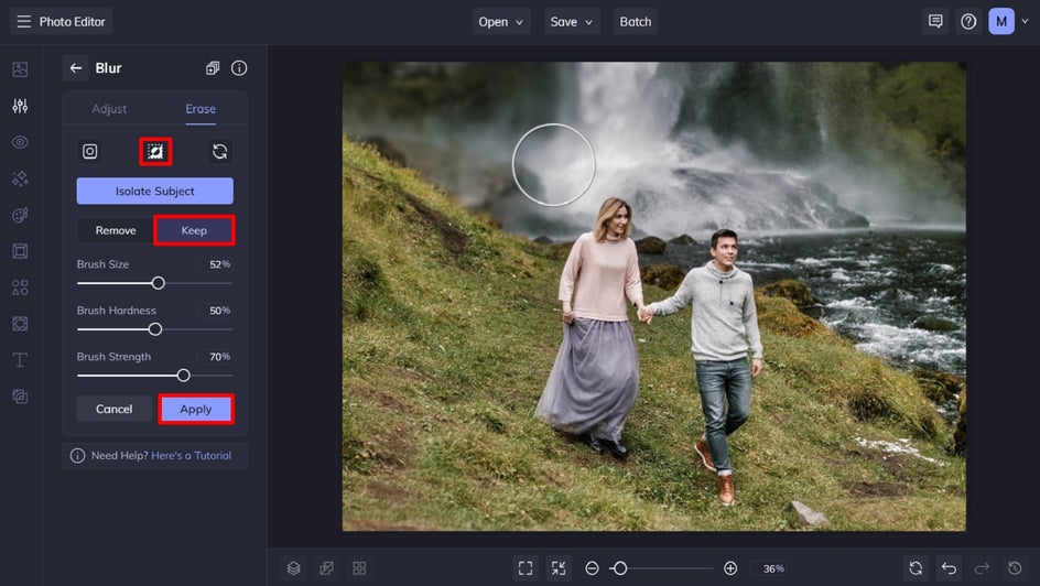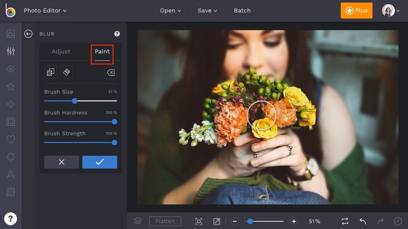 Use the corresponding sliders to adjust the brush size, hardness, and strength. Then, use your cursor to paint your blur effect where required.