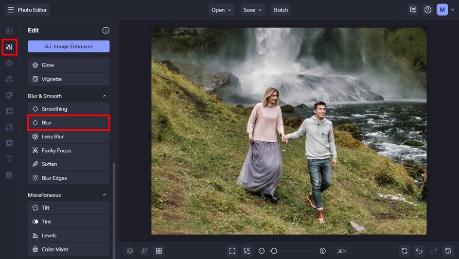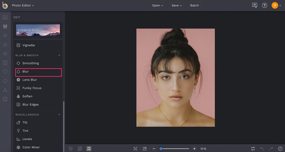 Navigate to Edit from the main menu on the left, then scroll to the Blur category. This tool can also be found under the same section of the mobile app.