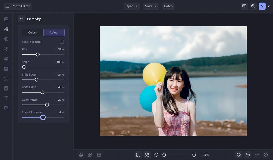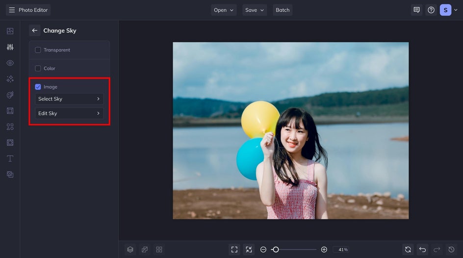 To get started, let’s head to the Sky Replacer, found in the Edit tab. We’re going to drag and drop our image directly onto the canvas, but you can also click on the Open menu to choose a different method.