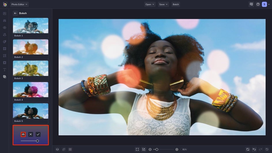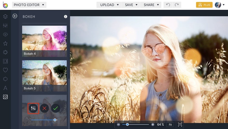 You’ll find several Bokeh effects that you can preview on your photo by clicking on them. Adjust the opacity with the slider or click on the Settings menu button to see all customization options.