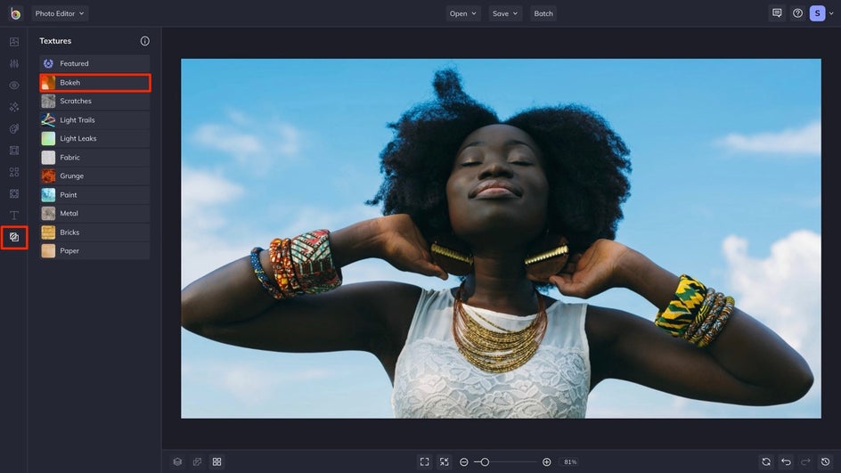 Whether you create something realistic or more on the artistic side, these Bokeh effects will destine your photos for greatness. Add a bokeh effect to your photos by heading to the Textures section of the Photo editor.