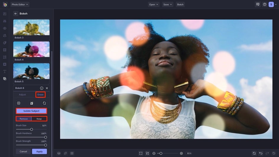 Here, you can click and drag to erase the effect from certain areas of your photo. You can also click Isolate Subject to make adjustments directly to your subject with more accuracy.