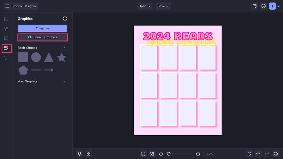 Before we start tracking our reading progress, we can customize our template even further by adding graphics from BeFunky’s Graphic Library, which includes thousands of hand-drawn vector graphics. To use it, first Search Graphics.