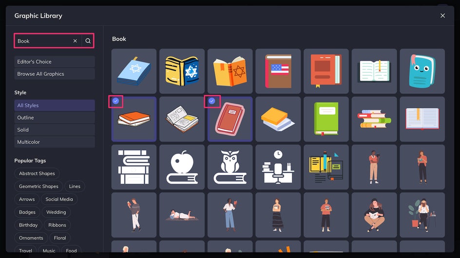 Then, use the search bar to look up the types of images you want to add. Click any graphic you want to add to your personal library. If it’s there, it will show up with a blue checkmark.