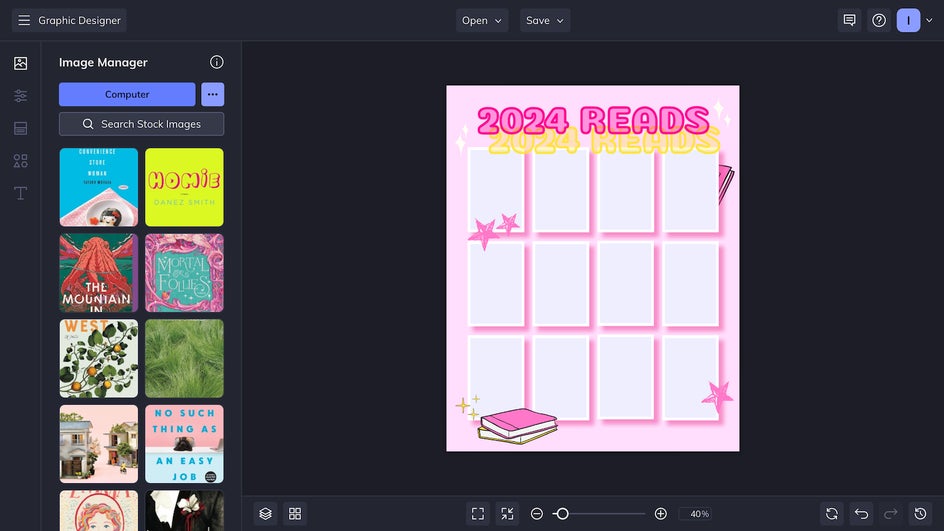 To add new books to this template throughout the year, all you have to do is add an image of your latest book cover to the Image Manager by uploading it from your Computer or another location. Then, drag and drop this image into one of the gray rectangles, and voila!