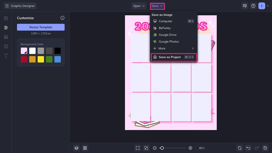 You can save this file on your computer or right to BeFunky’s cloud. For every new book you add, you should select Save as Project again. So when you want to update the template, all you have to do is open the .bfd or find it in your Project library.