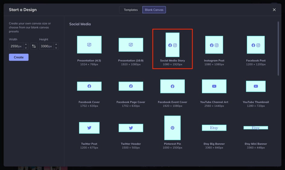 If you wish to create your own template, head to the Blank Canvas tab, select Blank Canvas, and choose Social Media Story. We are going to start by creating an establishing slide from a blank canvas.