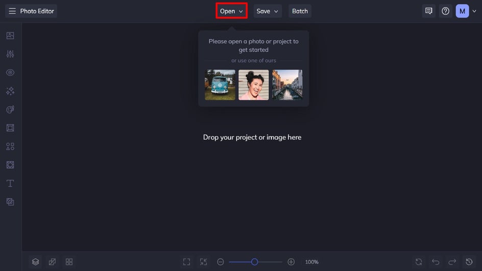 To get started, head to BeFunky’s Photo Editor and open a photo of your choice. Alternatively, you can drag and drop your image into the interface.