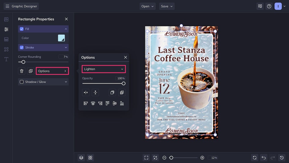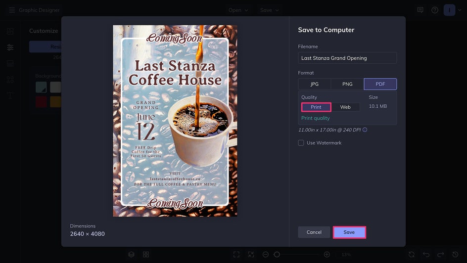 Once you’re happy with your adjustments, click Save at the top of the canvas and save your grand opening poster as a print-quality PDF for the best print results. Remember that your poster will probably be pretty large, so resolution matters!