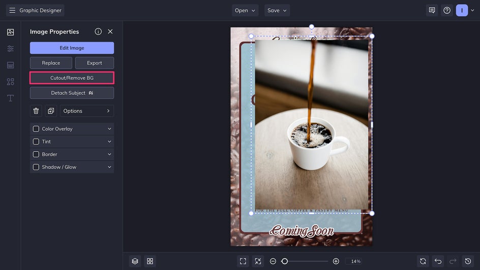 For most posters, you can click and drag your own photos to replace placeholder images, but in this case, the primary image uses a transparent background. To replicate this look, upload your own image, click it, and select Cutout/Remove BG.