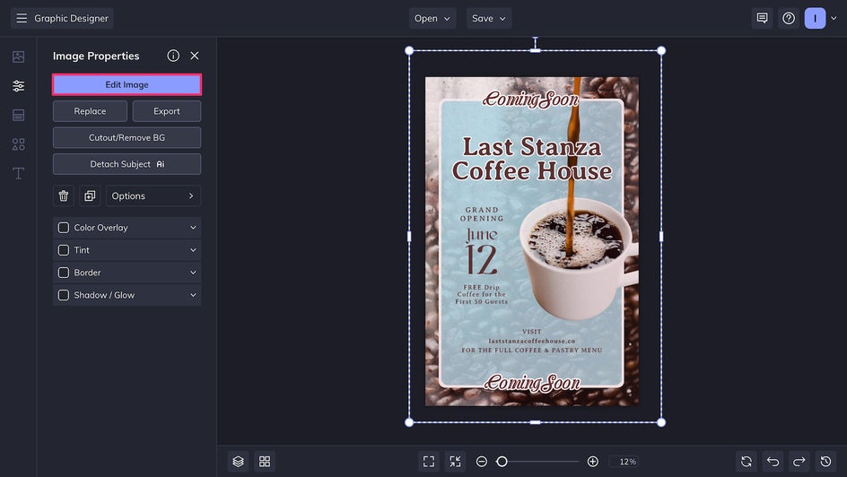 This poster is already looking good, but to make it stand out even more, we can add unique Artsy effects. These drawing and painting filters add color and texture while making your design look like a piece of hand-crafted art. Click on your photo and choose Edit Image.