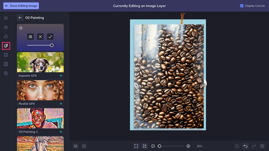 Then open up the Artsy effects tab and browse through the options before applying an effect of your choice. Here we’re using Oil Painting GFX so that the image still looks realistic, but has added depth of color and texture.