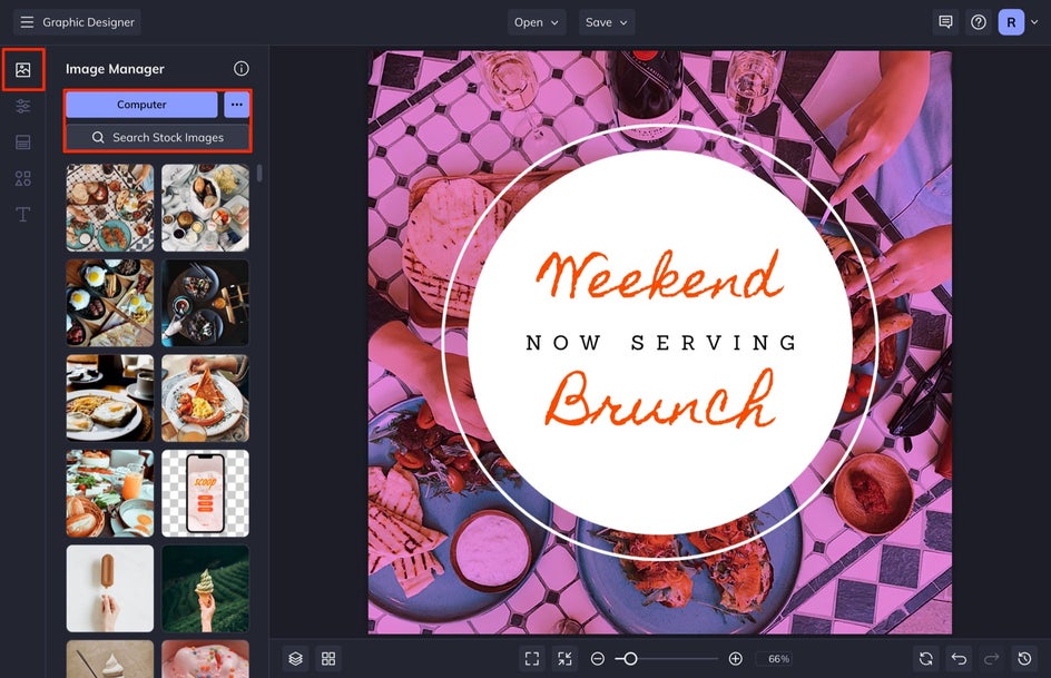 If your template has photos, it is important to update the imagery with your own photo or one that communicates the message of your update. You can update it with your own photo by selecting the Image Manager from the left-hand menu and then selecting Computer. You can also update your image with one of the thousands of stock images by selecting Search Stock Images.